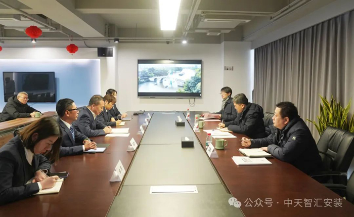 座谈伊始,李书记一行观看了中天智汇安装宣传视频,对公司有了整体了解。随后,公司总经理郑柏路介绍了过去一年公司的经营情况和2025年主要目标,以及公司在实际经营中遇到的主要困难,对李书记到企业排忧解难送服务表示感谢。