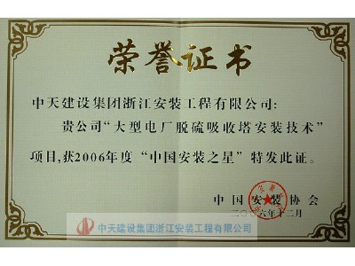 “大型电厂脱硫吸收塔安装技术”荣获2006年度“中国安装之星”