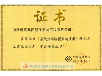 “空气分离装置安装技术”荣获2004年度“中国安装之星”